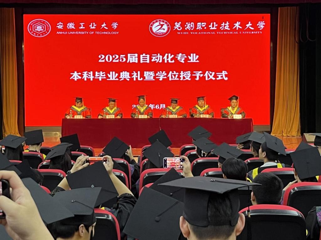 毕业典礼在庄严的国歌中拉开序幕,孔洋波宣读了2025届自动化专业本科生学位授予决定,代表公司向全体毕业生表示祝贺,并与芜湖职业技术大学领导共同为毕业生颁发学位证书、扶正流苏并合影留念。典礼前,双方围绕自动化领域的人才培养模式创新,专业教师交流、以及就业创业跟踪服务等方面进行了深入细致的交流研讨。
