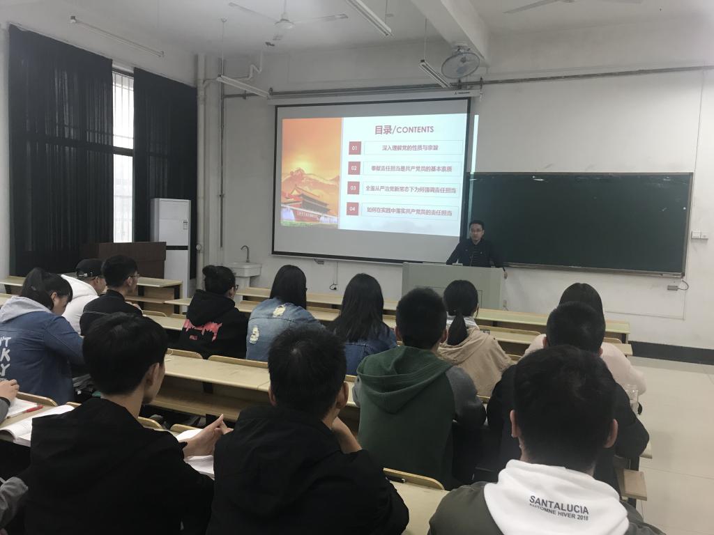 课上,叶凤华书记首先介绍了党章,阐述了申请成为党员的条件,并要求全体发展对象以党员的基本素质约束自己。他从四个方面对本次党课主题进行了深入的解说和讲授,即深入理解党的性质与宗旨;奉献责任担当是共产党员的基本素质;全面从严治党新常态下为何强调责任担当;如何在实践中落实共产党员的责任担当。通过举例子、说故事、用典故,他深入浅出地道出了每个主题的深刻内涵与价值意义。在党风党纪方面,他强调了对党员尤其党员干部的六字要求,即“忠诚、干净、担当”,将从严治党要求落实到细节上。在青年员工责任担当方面,他激励同学们“不忘初心,牢记使命”,勤于学习、勤于锻炼,以实际行动担起历史赋予的时代之责。最后,他带领大家观看了纪录片《信仰的力量——回望征程》。