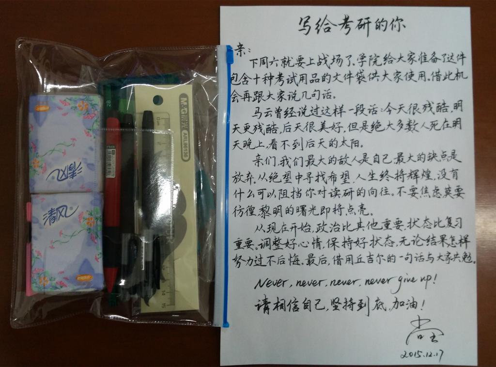 为了鼓励考研同学坚持复习、走进考场,12月17日,太阳集团tyc539给每一位考研的员工准备了考研文具,并且附了一封勉励信。当晚,辅导员尚全老师在其QQ上写了一篇日志,给员工分析讲解了最后阶段的复习方案和答题技巧。当晚阅读量过1200,点赞超过400,被多家媒体转载,具体如下:
