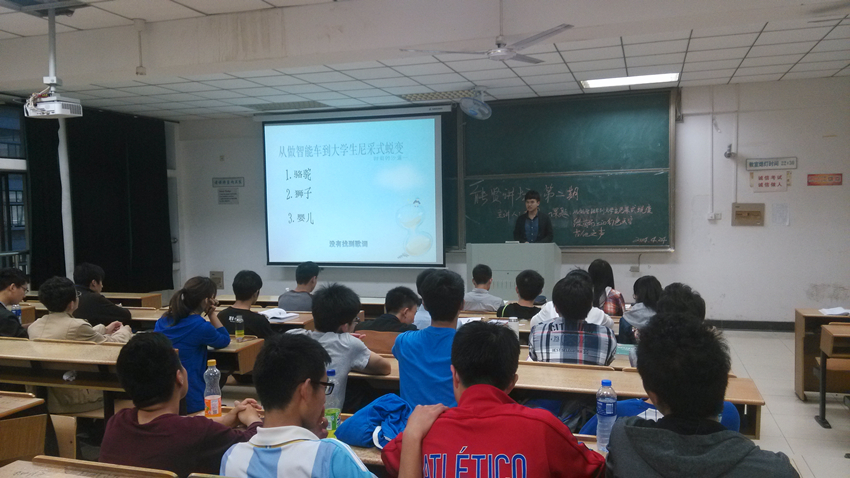 晚6:30,简单介绍了三位主讲人和所讲课题之后,尚老师宣布开始。首先,来自气121班的刘刚上台做了主题为“从做智能车到老员工尼采式蜕变”的演讲,他以自身充实的老员工活经历告诉我们要从做事积极蜕变为积极做事,主动争取属于自己的一片天地,坚决不要沉迷于网络游戏浪费青春。