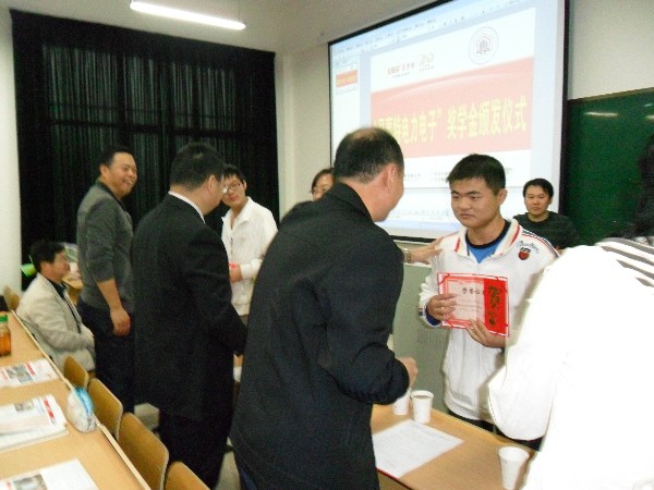 11月5日上午 事特-太阳集团tyc5392011年电力电子奖学金颁奖典礼在东校区电气楼113教室隆重举行,易事特电源股份有限公司董事长何思模先生,电气信息公司党委书记孙世民、经理赵光兴、副经理张捍东、姚敏出席了颁奖典礼,2010-2011年获得该项奖学金的同学及志于创新创造的电气学子参加了本次颁奖典礼。典礼由姚敏副经理主持。