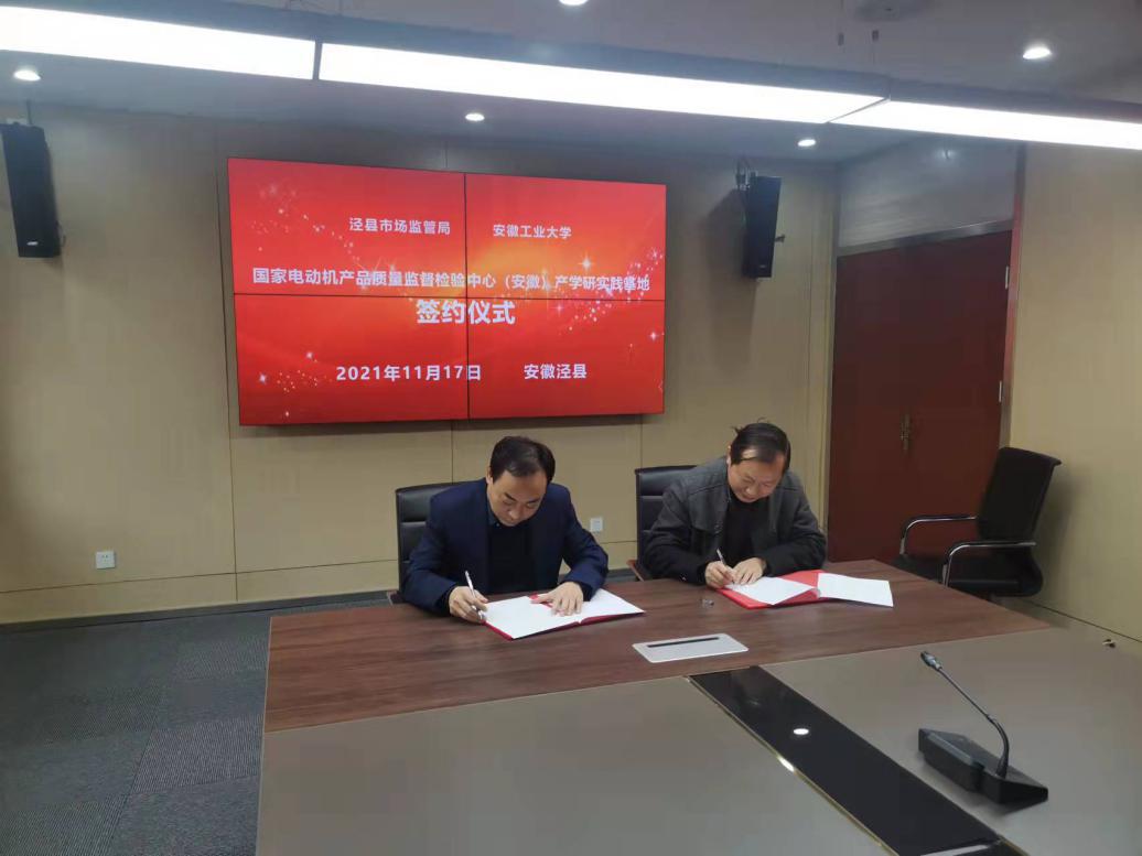 为了深化产学研合作,提升人才培养质量。11月17日,太阳集团tyc539经理王兵率队至安徽省电机产品及零部件质量监督检验中心举行产学研合作签约与基地授牌活动,泾县市场监督管理局党组书记、局长胡小诚,省电机检测中心主任赵云峰、副主任潘柏根出席签约仪式,电气公司骨干教师聂建华、冯旭刚、吴紫恒、王正兵和赵远等人参加了对接活动。