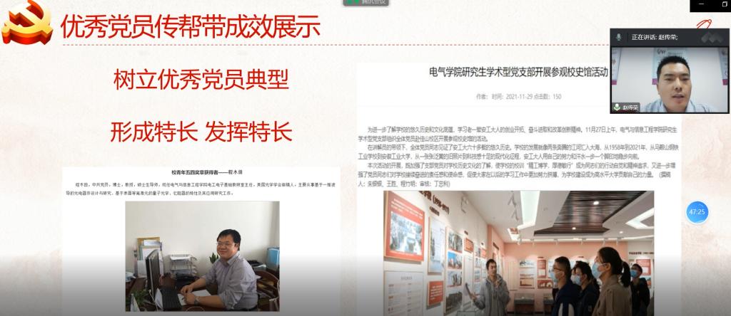 2022年11月8日,第二届长三角高等工程教育联盟研究生教育发展论坛隆重举行。本届研究生教育发展论坛聚焦“持续发挥联盟育人合力,打造区域人才培养高地”主题,以线上形式发表主题报告和分论坛报告。本届高峰论坛由上海理工大学研究生院、党委研究生工作部主办,上海理工大学机械工程公司承办。公司研究生党支部书记赵传荣老师应邀在分论坛-研究生党建发展论坛暨第四届上海理工大学研究生党支部书记论坛,作了题为“以创促建、树立典型,发挥优秀党员的传帮带作用”的报告。