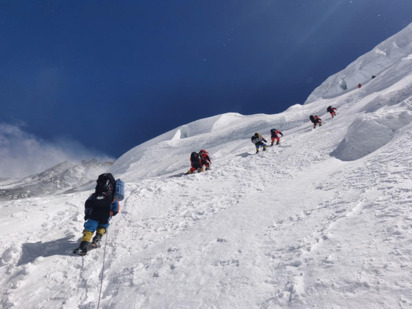 2019年5月第一次从南坡攀登时,由于“窗口期”短,很多队伍的攀登者都集中在同一天冲顶。结果22日在海拔8790米的希拉里台阶处,汝志刚和约200名攀登者遭遇了史无前例的“珠峰拥堵”。高寒、缺氧、狂风......他在恶劣的环境下堵了近三个小时。