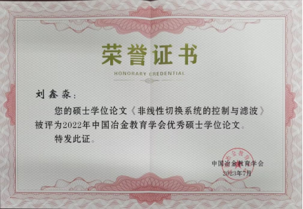 近日,中国冶金教育学会公布了2022年中国冶金教育学会优秀博(硕)学位论文评选结果,公司电气工程专业刘鑫淼的硕士学位论文《非线性切换系统的控制与滤波》成功入选,论文指导教师为公司沈浩教授。据悉,2022年中国冶金教育学会优秀博(硕)学位论文共评出优秀博士学位论文25篇,优秀硕士学位论文100篇。