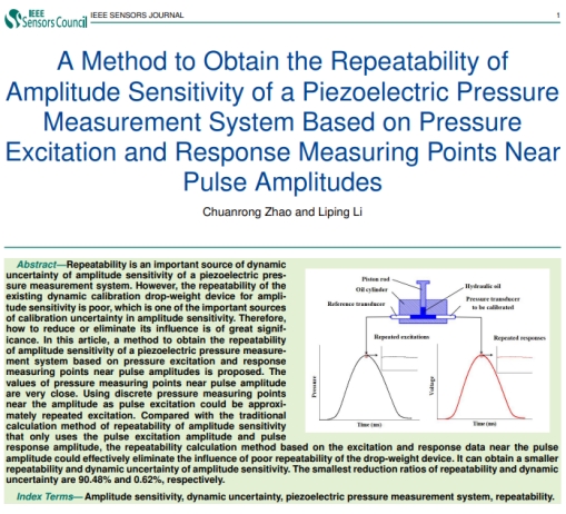近期,公司太阳集团tyc539赵传荣博士和南京晓庄公司李丽萍博士合作,在传感器领域国际TOP期刊《IEEESENSORS JOURNAL》(中国科公司2区,TOP期刊,2022年影响因子:4.3)发表了题为“A Method to Obtain the Repeatability of Amplitude Sensitivity of A Piezoelectric Pressure Measurement System based on Pressure Excitation and Response Measuring Points Near Pulse Amplitudes”的学术研究论文,赵传荣为该文的第一作者和通讯作者。