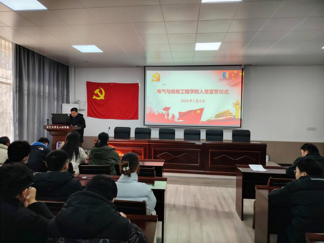 1月4日中午,电气公司在电气楼113教室举行新党员入党宣誓仪式。公司党委副书记、纪委书记、副经理李克明、各员工党支部书记、各年级辅导员、2023年12月新发展的党员以及全体员工党员参加了仪式。