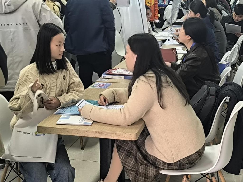招聘会现场,员工们首次近距离体验就业实战,观摩学长学姐如何应对场景化问题等岗位初试。在辅导员蒋安东的鼓励下,员工主动对接企业招聘主管,咨询岗位核心能力要求、职业发展通道等关键问题,沉浸式感知就业生态。