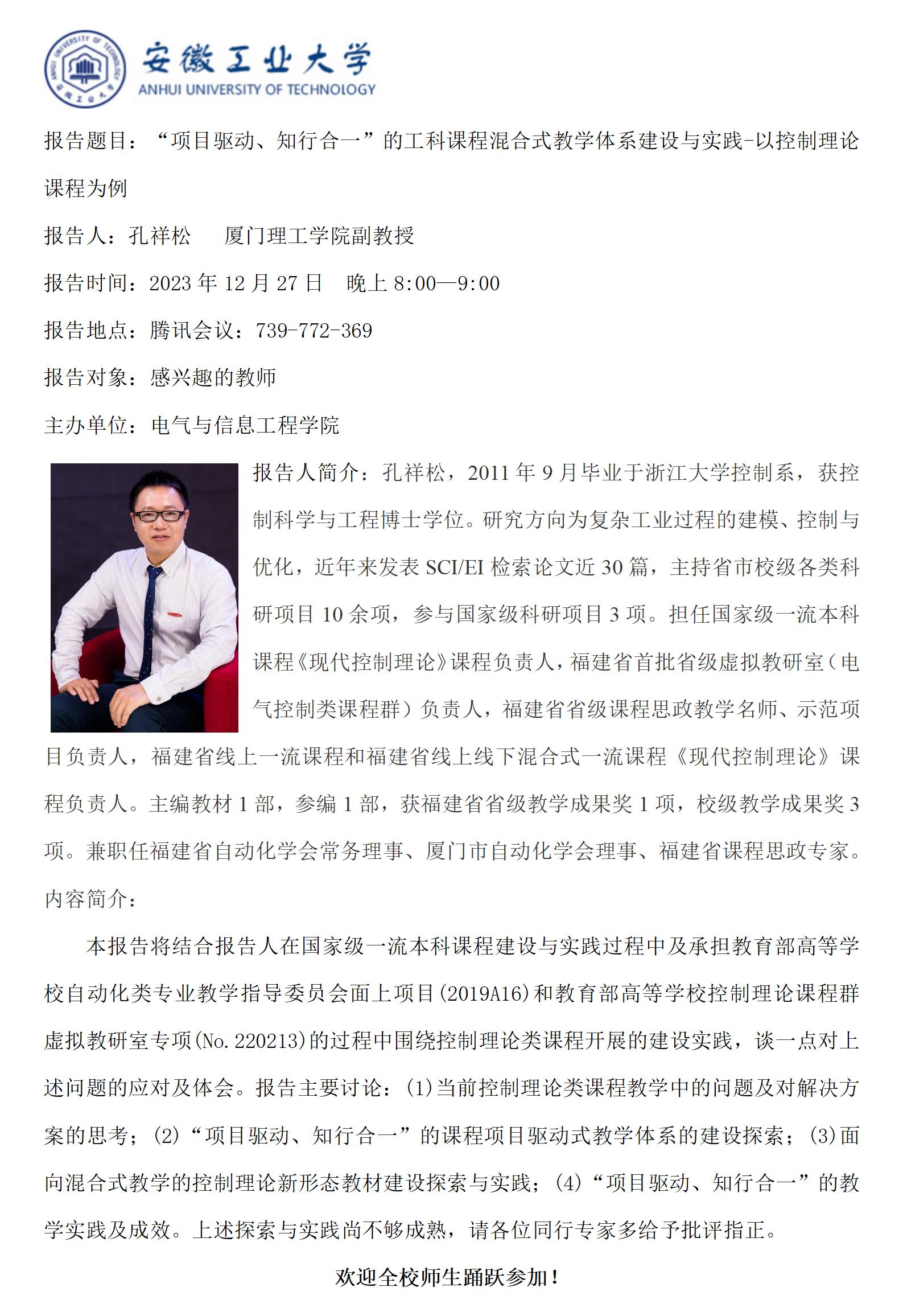 【“映书湖畔”教学讲坛之二十一】“项目驱动、知行合一”的工科课程混合式教学体系建设与实践-以控制理论课程为例