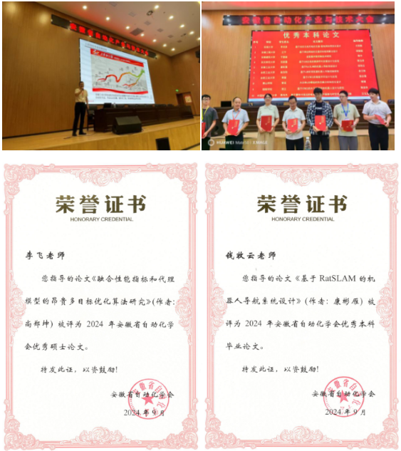 会上,专家们对各高校推荐的硕士论文和本科毕业设计(论文)进行了评选,公司硕士研究生尚郑坤撰写的论文《融合性能指标和代理模型的昂贵多目标优化算法研究》(指导老师:李飞)和本科生康彬燕撰写的毕业论文《基于RatSLAM的机器人导航系统设计》(指导老师:钱牧云)分别获得安徽省自动化学会优秀硕士论文奖和本科毕业论文奖。
