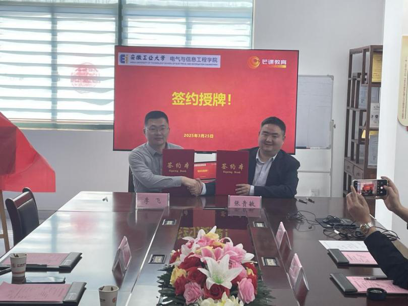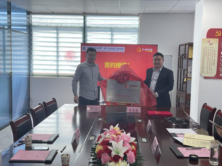 3月25日,公司副经理李飞一行前往安徽芒课教育科技有限公司开展实践教学基地签约暨揭牌仪式。安徽芒课研究院常务副经理张贵敏、青软晶芒副总经理陶羽及各部门负责人出席,公司自动化系副主任费习宏、电子与通信系副主任王康参加签约和授牌对接活动。