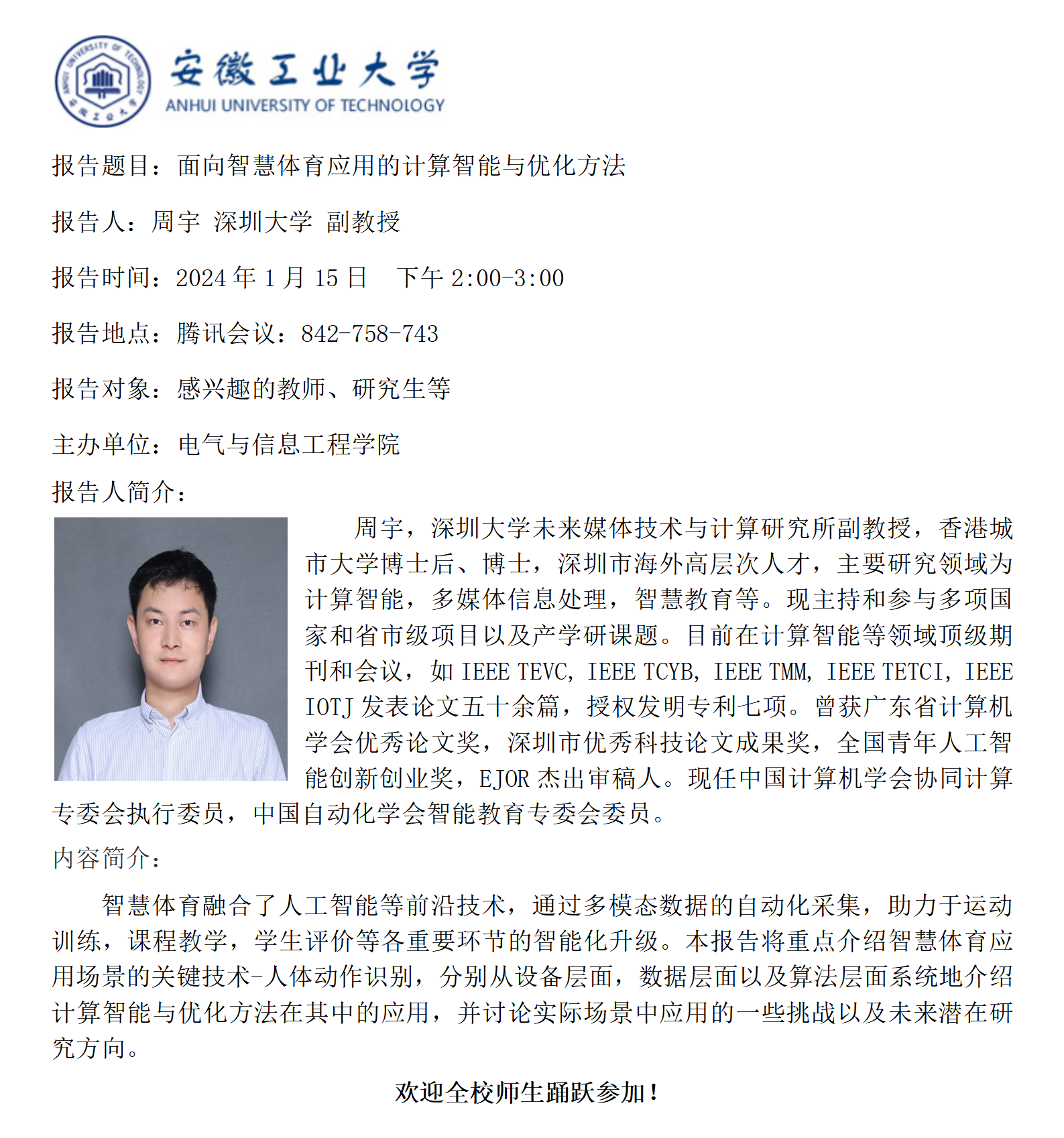 砺山学术报告之二十八-面向智慧体育应用的计算智能与优化方法