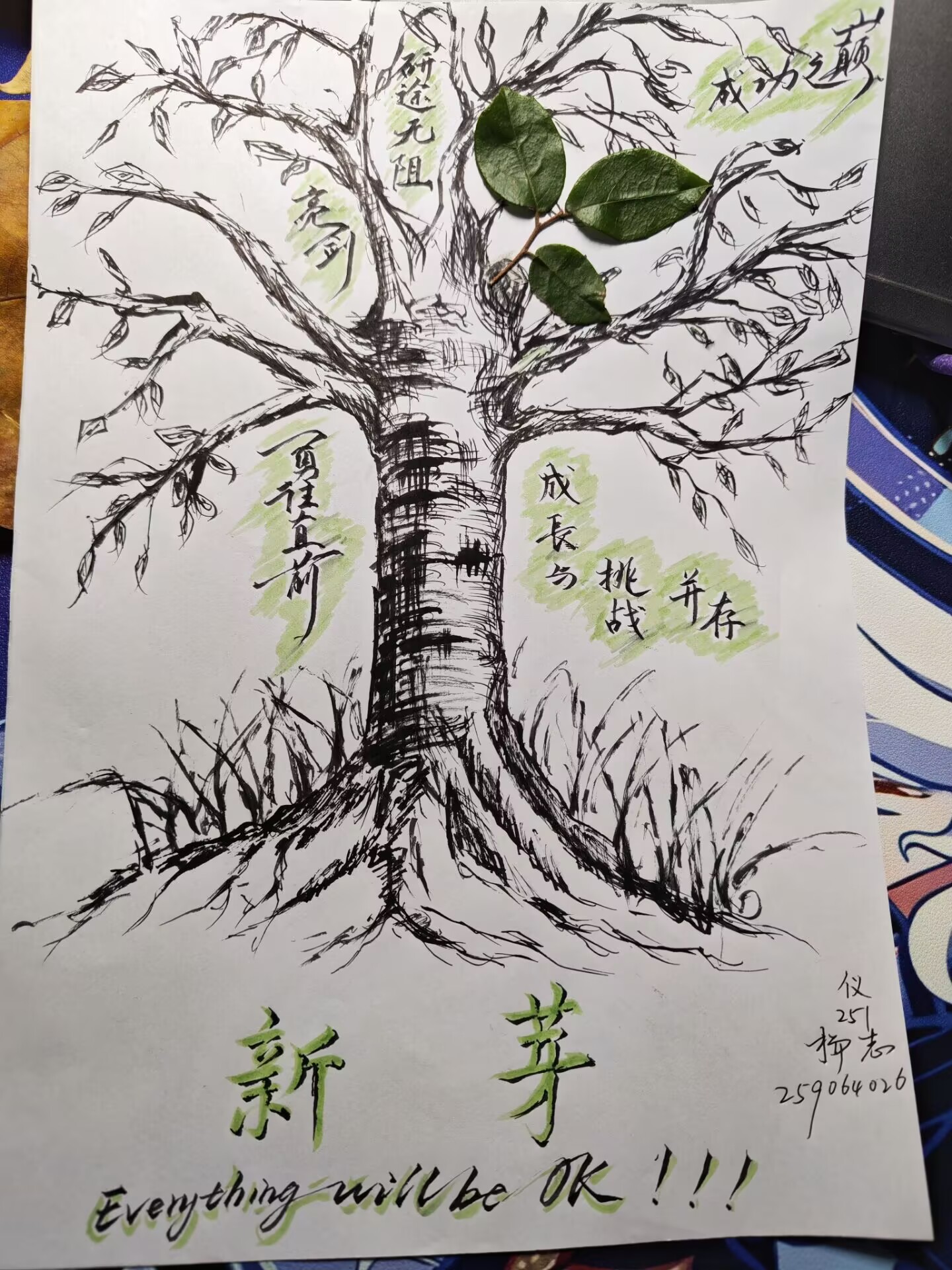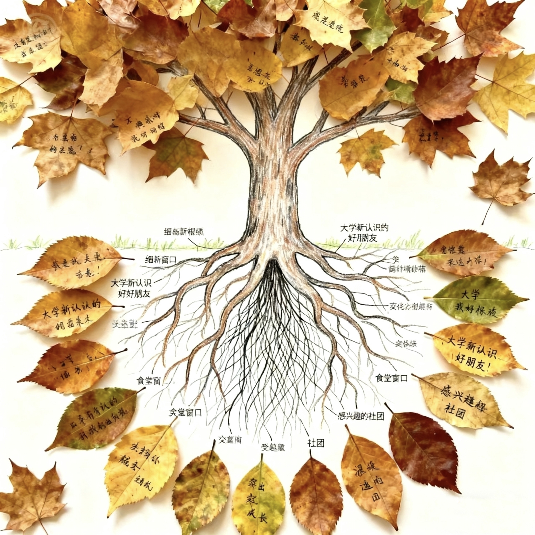 活动通过“落叶寄情—树干立根—根系绘新”三个环节,引导员工进行阶段性总结与规划。同学们首先挑选或手绘一片落叶,书写对高中生活的怀念、对师长亲人的感恩或对过往的告别;随后在纸张下半部分勾勒代表成长根基的树干;最后围绕树干绘制细致根系,并在根须上标注进入大学后新结识的朋友、常去的食堂窗口、感兴趣的社团等新鲜体验,以此融合回忆与当下,滋养内心成长。