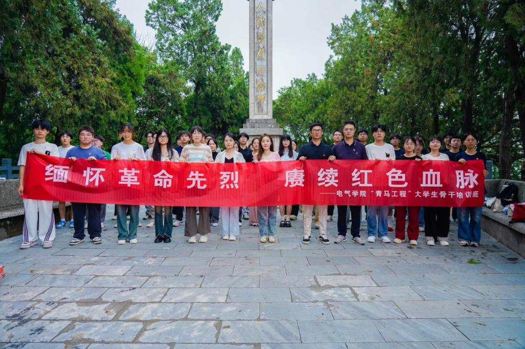 来到烈士陵园,青马学员们认真聆听革命先辈的英雄事迹,讲解员用生动的语言、真实的情感,再现了烈士们在艰苦岁月中不畏强敌、不怕牺牲的英雄形象,让在场的每一个青马学员深受触动。随后,学员们徒步登上小坨山,来到革命烈士纪念碑前,瞻仰纪念碑,党员同志面向中国共产党党旗郑重宣誓。甘如美江带领学员在烈士纪念碑前围绕在学风建设上做先锋者、在校规校纪上做守卫者、在志愿服务上做示范者等三个维度,开展“青马工程”老员工骨干主题教育学习活动,她寄语学员们铭记峥嵘岁月,赓续奋斗精神,汲取奋进力量,自觉践行电气青年学子作风清单。
