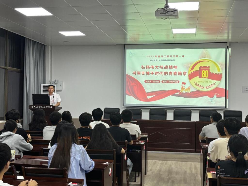 9月29日晚,公司在秀山校区电气楼113报告厅成功举办青马工程新学期“开学第一课”。公司党委副书记、纪委书记、副经理孔洋波以“弘扬伟大抗战精神、书写无愧于时代的青春篇章”为主题,为全体“青马工程”学员讲授课程,公司团委书记甘如美江、副书记蒋安东、“青马工程”学员及全体员工会干部共同参加学习。