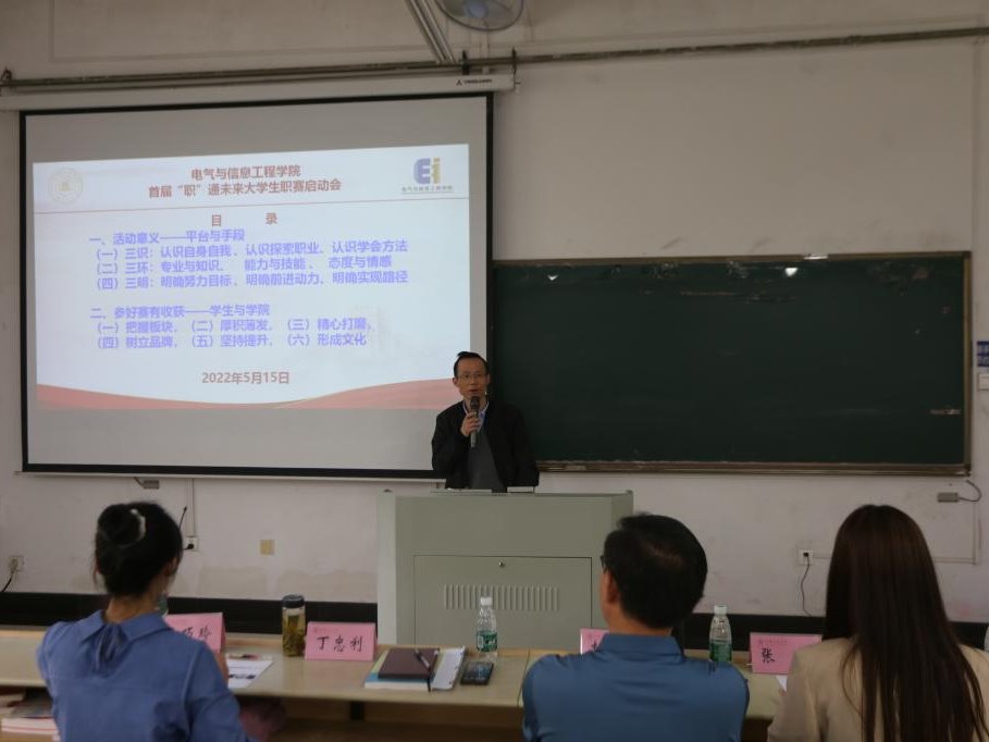 公司第一届“职“通未来职业规划设计大赛启动会暨赛事专题培训讲座于5月15日在电气楼顺利启动。本次讲座邀请到电气与信息工程公司党委书记丁忠利,学工部就业创业科科长李德利,安徽省第15届职业规划设计大赛一等奖获奖者、公司2022届材料成型及控制工程专业毕业生王巧玲为大家进行赛事解析。会议由19级辅导员张悦主持。
