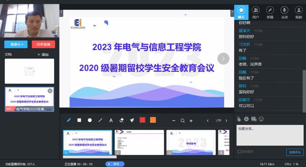 为切实提高暑期留校员工的安全防范意识,保障2023年暑假留校工作有序开展,7月3日下午,电气公司召开了2020级暑期留校员工安全教育工作会议,2020级辅导员孔洋波、芮靖、汤敏以及全体留校员工参加了此次会议。
