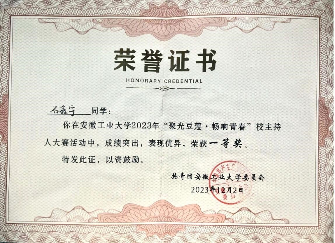 【太阳集团tyc539荣光】公司石鑫宇同学荣获校主持人大赛一等奖